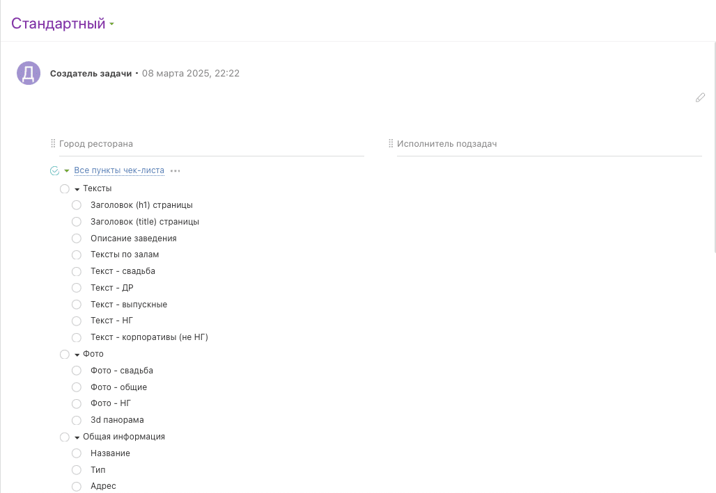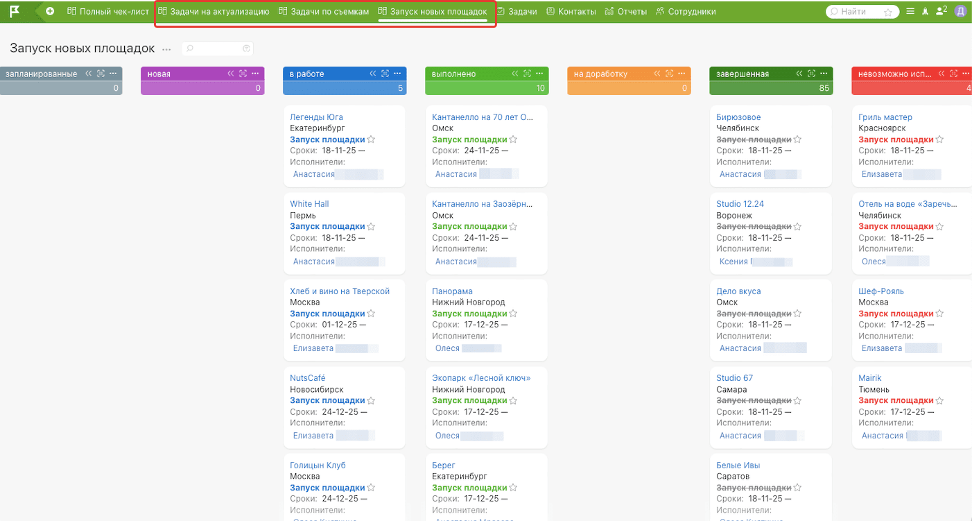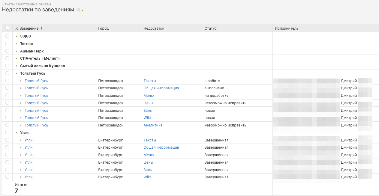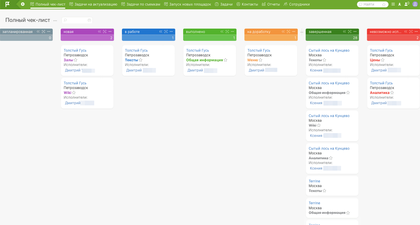 ЗадачаТехническое заданиеРеализация задачиЭтапы работФинальный результат Задача Кратко техническое задание (ТЗ) от заказчика было сформулировано следующим образом: У нас есть порядка 5000 ресторанов в базе, по каждому из них менеджеры заполняют контент на сайте по определенным пунктам. Мы бы хотели все это превратить в систему, в которой можно отслеживать, какие пункты по каждому ресторану выполнены и когда, какие нет и почему, и также видеть статистику в разрезе гео и выработки каждого сотрудника. Раньше клиент никогда не пользовался ПланФиксом, поэтому мы с 0 разработали и внедрили систему управления контентом с помощью данного инструмента. Перейдем к этапам внедрения. Техническое задание В процессе обсуждения задач внедрения ТЗ несколько раз перерабатывалось и уточнялось. Вот итоговая логика работы: Банкетный зал – основная сущность системы. Контент – это страницы заведений на gorko.ru. База всех банкетных залов должна быть выгружена в ПланФикс и ежедневно обновляться. При выгрузке происходит как обновление списка банкетных залов, так и обновление определенных параметров существующих залов: ID, ссылка на заведение на gorko.ru, город заведения, тип размещения ресторана (бесплатно, абонентка, комиссия), скрыто ли заведение (да/нет), удалено ли (да/нет), дата последней синхронизации. Проверку контента банкетного зала производит руководитель по определенным пунктам. Это большой список пунктов, и каждый пункт имеет свой регламент проверки. На основе проведенной проверки должны быть вынесены пункты по которым требуется доработка (недостатки). И эти пункты должны быть переданы в работу контент-менеджеру как задачи. Контент-менеджер выполняет задачу и отправляет руководителю на проверку. Руководитель проверяет выполненную задачу. Если задача выполнена верно, то она переводится руководителем в статус Завершенная. Если нет, возвращается на доработку контент-менеджеру. Всего задачи могут принимать следующие статусы: Запланированная, Новая, В работе, Выполнено, На доработку, Завершенная, Невозможно исправить. Переводить задачу в статусы Запланированная, На доработку и Завершенная может только руководитель. Кроме проверки контента банкетного зала по всем пунктам есть ряд других задач по заведениям: Задачи на актуализацию, Задачи по съемкам, Запуск новых заведений. Под задачи такого плана должны быть созданы отдельные канбан-доски. По каждому заведению должна быть видна Дата последней проверки заведения – дата, когда последняя задача по недостатку была переведена в статус Завершенная. Нужно иметь возможность построить Отчеты по выполненным задачам в разрезе сотрудников, банкетных залов, недостатков. Реализация задачи Мы зарегистрировали аккаунт администратора в ПланФикс и перешли к настройке. Этапы работ Было принято решение сущность Контакты в ПланФикс выделить для базы банкетных залов. Таким образом Контакт = Банкетный зал. Были созданы кастомизированные поля для Контакта согласно ТЗ и сформировано техническое задание программисту для выгрузки базы банкетных залов в ПланФикс. По итогу база банкетных залов попала в ПланФикс и стала выглядеть следующим образом: Разработали карточку задачи по проверке контента банкетного зала по всем пунктам:Данную карточку заводит руководитель на выбранный банкетный зал из базы и пров