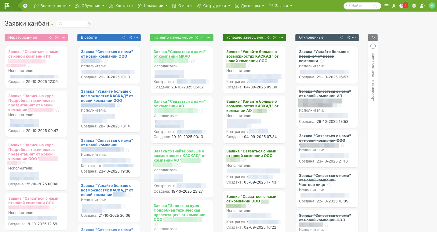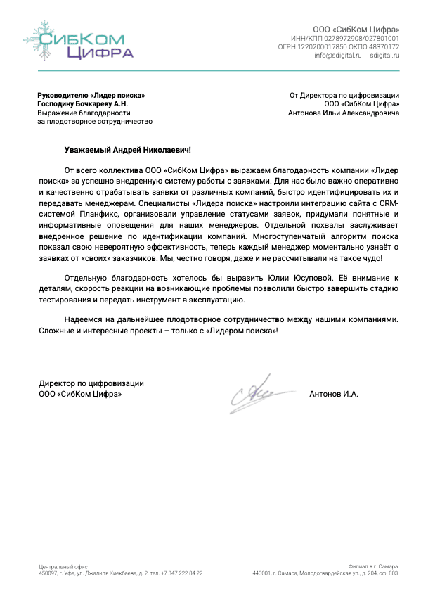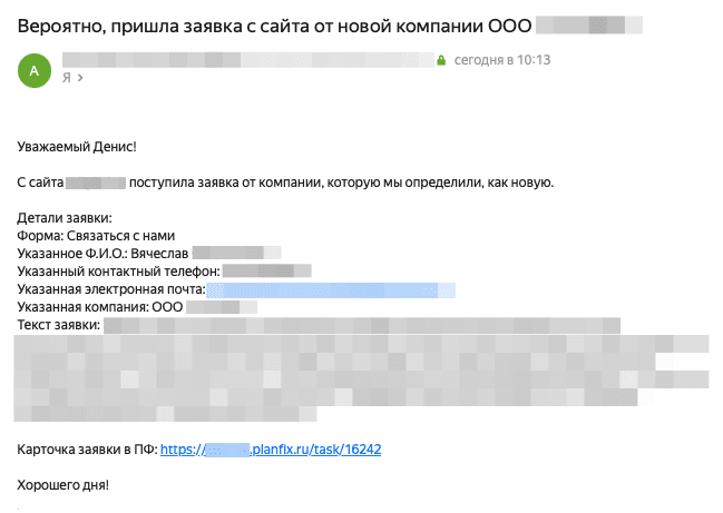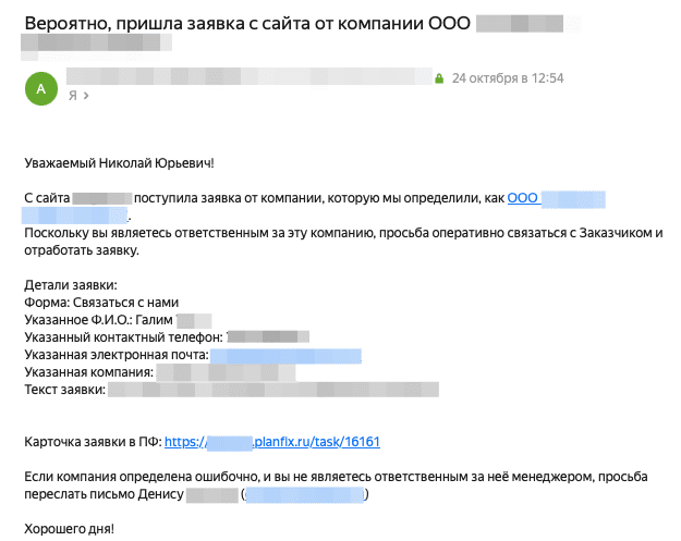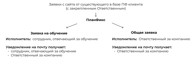 Техническое заданиеРеализация задачиПредварительные работы Этапы основных работФинальный результат Техническое задание В процессе обсуждения задач внедрения Техническое задание (ТЗ) несколько раз перерабатывалось и уточнялось. Вот итоговая логика работы: Все заявки с форм обратной связи сайта должны попадать в ПланФикс в отдельный Дашборд. На сайте клиента существует 2 типа заявок – заявки на обучение и общие. В ПланФикс заявка должна попадать определенному сотруднику, в зависимости от того, какой тип заявки был отправлен. Заявки любого типа могут принимать статусы: Неразобранное, В работе, Принято менеджером, Успешно завершенная, Отклоненные. Если пришла заявка, то смотрим: a. Заявка от компании, которая уже есть в базе ПланФикс: — и по компании есть Ответственный, то обрабатывать заявку должен назначенный Ответственный (за исключением заявок по обучению) и она сразу попадает в статус Принято менеджером.Заявка не может быть переведена в статус Принято менеджером, если компания не заведена в базу ПланФикс и по ней не назначен Ответственный. Перевести заявку в статус «Принято менеджером» может только Ответственный по компании менеджер.— и по компании нет Ответственного, то заявку сначала должен обработать специальный сотрудник, затем должен быть назначен Ответственный по компании. Назначенный Ответственный далее обрабатывает заявку (за исключением заявок по обучению). b. Заявка от новой компании, то заявку сначала должен обработать специальный сотрудник, затем должен быть назначен Ответственный. Ответственный добавляет компанию в базу ПланФикс и далее обрабатывает заявку. Все заявки по обучению обрабатывает специальный сотрудник. При поступлении заявок Исполнителю по заявке должно уходить письмо на электронную почту с определенной текстовкой. Также уведомления должен получать Ответственный по компании. / Реализация задачи Предварительные работы Перед тем как приступить непосредственно к настройкам в ПланФикс мы структурировали все формы заявок с сайта и привели их в порядок – разбили по группам, актуализировали поля форм, во все формы добавили поле «Название юр. лица», так как в дальнейшем эта сущность использовалась нами для реализации мэтчинга между Названием компании из заявки и Названием компании в базе ПланФикс. Поскольку у клиента уже был аккаунт ПланФикса мы попросили завести еще одного сотрудника с правами Администратора и выдать нам доступ. Дальнейшие работы проводили с этого аккаунта. Этапы основных работ Создали отдельный Процесс задач под нашу задачу, чтобы не затронуть остальные рабочие процессы ПланФикса. Разработали Шаблон задачи для поступающих заявок. Заявка в нашем случае = Задача (персональные данные заблюрены): Шаблон задачи в ПланФикс по заявке с сайта Создали отдельную канбан-доску со статусами Неразобранное, В работе, Принято менеджером, Успешно завершенная, Отклоненные. Через API ПланФикса разработали скрипт, который передает заявки с сайта напрямую в ПланФикс по логике из ТЗ. Ключевым моментом было разработать алгоритм, который бы распознавал какой клиент отправил заявку – новый или существующий. И на основе этого определить, кто станет Исполнителем по заявке (задаче). В результате был разработан скрипт, который производит сверку данных из заявки с данными в базе ПФ по 3 парам