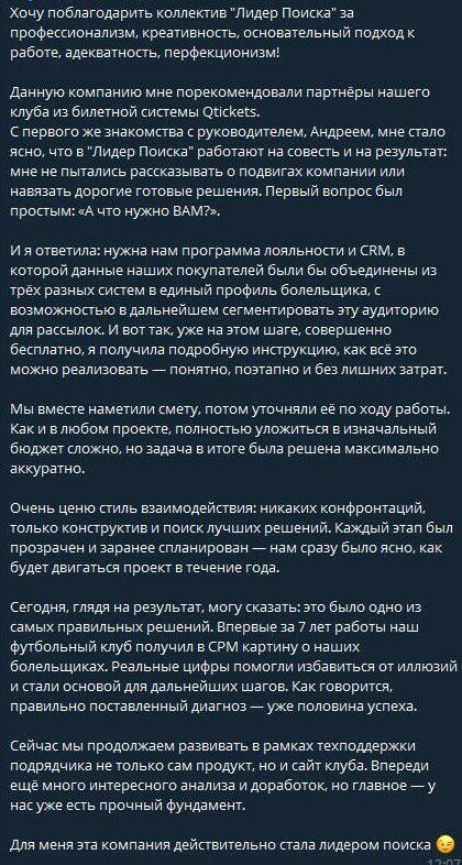 Вводные данные и формулирование задачРазработка ядра программы лояльностиДоработка ЛК сайта и процессов оформления заказа атрибутики на сайтеРазработка CRMИтоги Вводные данные и формулирование задач На момент обращения у Клуба уже был сайт на CMS Bitrix, который позволял: ознакомиться с расписанием матчей; купить билеты на матчи через интегрированный в сайт сервис Qtickets; приобрести атрибутику в интернет-магазине с возможностью положить товары в корзину и оплатить онлайн. Какие задачи поставил перед нами Заказчик? Внедрение программы лояльности (далее по тексту — ПЛ) болельщиков, которая позволит: повысить вовлеченность болельщиков, стимулировать их к регистрации в личном кабинете (далее по тексту — ЛК) сайта; собирать больше информации о болельщиках; начислять болельщикам баллы за покупку билетов, абонементов, сертификатов и атрибутики, а также за заполнение полей в ЛК и выполнение определенных действий в ЛК; списывать болельщикам накопленные баллы при покупке билетов, абонементов, сертификатов и атрибутики. Реализация CRM, которая обеспечит: возможность сегментации болельщиков по обширному набору полей; возможность сохранять сформированные сегменты, обновлять и выгружать их в формате Excel; в перспективе осуществление рассылок на эти сегменты болельщиков по каналам Email, Телеграм, ВК, SMS. По итогу наметили с Заказчиком 4 основных направления работы: Формирование и программирование логики ПЛ на базе фреймворка Laravel; Интеграция ядра ПЛ с существующими системами (Qtickets, сайт на Bitrix, Call-центр) для сбора и обработки данных; Доработка ЛК сайта и адаптация процессов покупки билетов и атрибутики под программу лояльности; Проектирование и разработка CRM. Предварительная схема взаимодействия сервисов между собой Мы часто в своих кейсах пишем о том, как важно, чтобы Заказчик приходил на разработку/редизайн с уже сформулированными пожеланиями, референсами, техническим заданием. Для этого ему необходимо заранее проанализировать, зачем нужно реализовывать ту или иную задачу, какую боль бизнеса/покупателя она закроет, что должно получиться в результате. Это позволяет не упустить что-то важное в процессе разработки и достигнуть поставленных целей. В данном случае Заказчик нас не просто приятно удивил — мы «ахнули» от степени осознанности, подготовленности и вовлеченности клиента! Но обо всём по порядку :) Разработка ядра программы лояльности Программа лояльности — это система, которая поощряет постоянных клиентов за их активность, делает их более вовлечёнными: им интересно участвовать, копить баллы, получать награды и в итоге чаще посещать матчи любимой команды. Мы начали работу с совместного составления технического задания на ПЛ. Заказчик подготовил документ со списками сущностей (баллы, ранги, достижения, задания, челленджи), их описаниями и условиями получения болельщиками: начисления/списания баллов, присвоения наград за получение достижений, выполнение заданий и т.д. Даже после такой кропотливой работы Заказчика потребовалось обсудить большое количество составленных нами уточняющих вопросов, важных для логики будущей ПЛ. Основной пул вопросов закрыли на этапе составления ТЗ, но фактически обсуждение всё новых вопросов продолжалось на протяжении всей разработки из-за огромного количества нюансов, которые предусмотреть на 